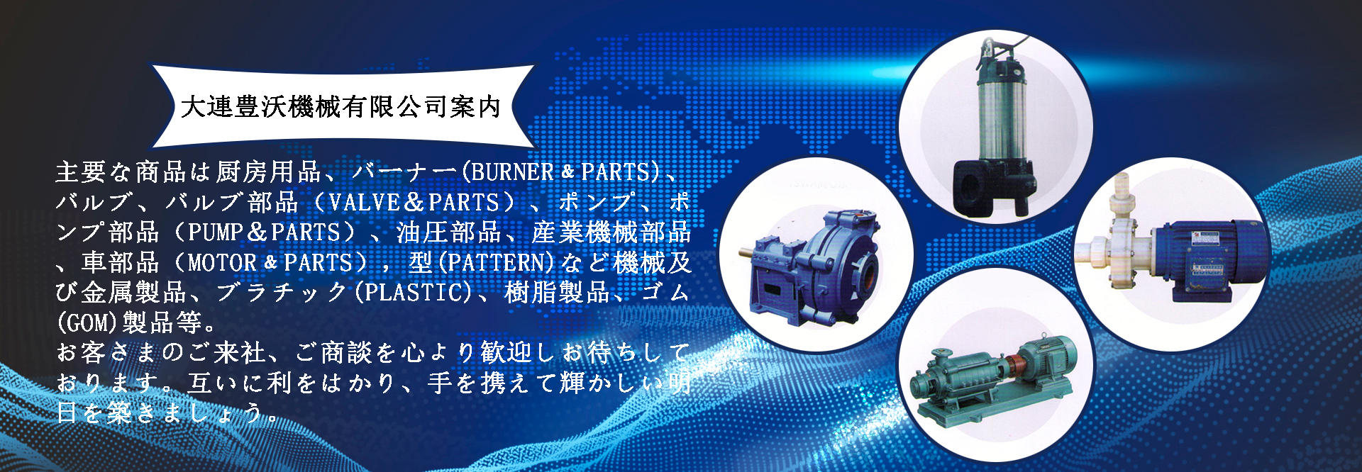 大連豊沃機械有限公司は國際貿(mào)易を主にして 専門商社でおり、子會社の機械加工工場を1社持ち、業(yè)務(wù)提攜パトーナが數(shù)社あります。國際貿(mào)易を従事して十年以上、メインは日本向けですが、アメリカ、ューロパ市場向けも少しあります。砂鋳造(CASTING)(FC,FCD,FACD,ADI)、ロストワックス(LOST-WAX)、鋳鋼(SC,SCS)、ステンレス(SUS)、ダイカスト(DIE-CASTING)(アルミ、真鍮)、鍛造(FORGING)、プレス(PRESS)、製缶(WELDING)など幅多く分野ております。主要な商品は廚房用品、バーナー(BURNER﹠PARTS)、バルブ、バルブ部品(VALVE&PARTS)、ポンプ、ポンプ部品(PUMP&PARTS)、油圧部品、産業(yè)機械部品、車部品(MOTOR﹠PARTS),型(PATTERN)など機械及び金屬製品、ブラチック(PLASTIC)、樹脂製品、ゴム(GOM)製品等。